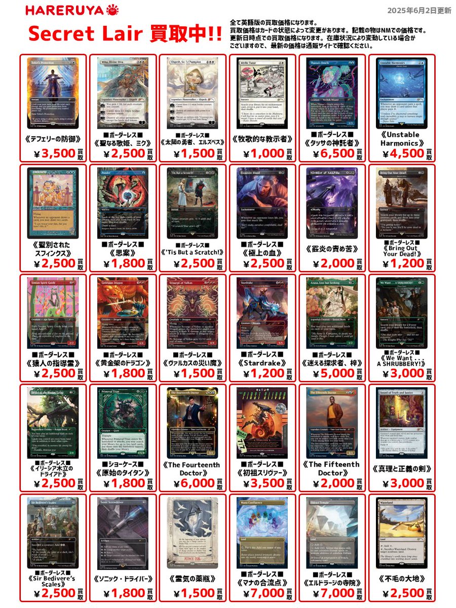 【買取情報】 🧙♂️『Secret Lair』買取募集中🧙♂️ 英語・通常版参考価格はこちら🔽 (1012)《マナの合流点》 ¥7,000 (1234)《迷える探求者、梓》¥5,000 (1691)《テフェリーの防御》¥3,500 (1585)《聖なる歌姫、ミク》 ¥2,500 (9992)《霰炎の責め苦》¥2,000 ご来店お待ちしております😆