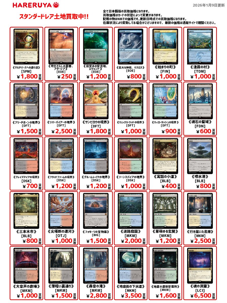 【買取情報】 スタンダードのレア土地買取募集中🏝️ 日本語・通常版の買取価格🆙商品はコチラ 《薄暗い裏通り》[MKM] ¥1,500 《ウィローラッシュの境界》[DFT] ¥900 《ブレイズマイアの境界》[DSK] ¥700 《寓話の小道》[BLB] ¥400 1枚からご査定承ります👌 お気軽にお持ち込みください🎵
