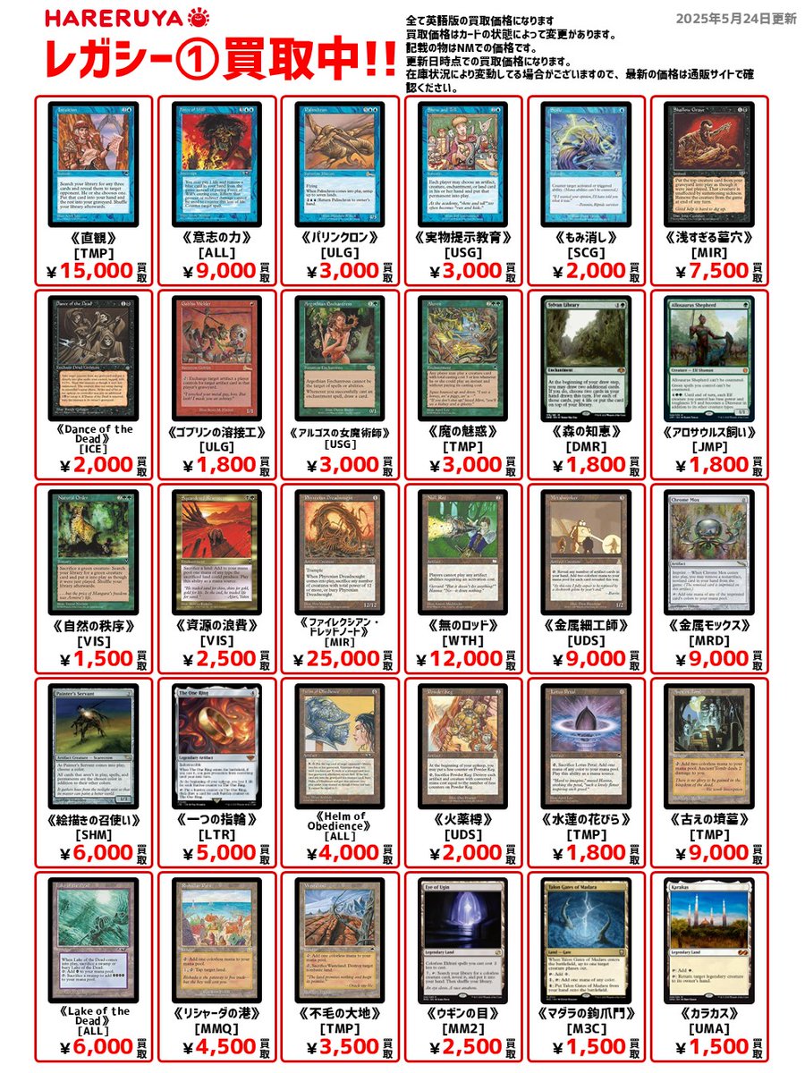 【買取情報】 🏛️レガシー買取募集中🏛️ 英語版参考価格はこちら🔽 《ファイレクシアン・ドレッドノート》[MIR] ¥25,000 《意志の力》[ALL] ¥9,000 《リシャーダの港》[MMQ] ¥4,500 《ウギンの目》[MM2] ¥2,500 《火薬樽》[UDS] ¥2,000🆙 《騙し討ち》[USG] ¥1,200 ご来店お待ちしております🤩
