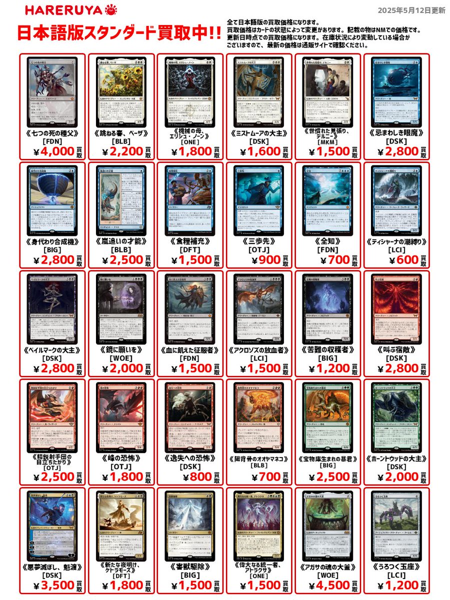 【買取情報】 ⚔️スタンダード買取募集中⚔️ 《アガサの魂の大釜》[WOE] ¥4,500 《七つの死の種父》[FDN] ¥4,000🆙 《悪夢滅ぼし、魁渡》[DSK] ¥3,500 《嵐追いの才能》[BLB] ¥2,500 《精鋭射手団の目立ちたがり》[OTJ] ¥2,500🆙 《食糧補充》[DFT] ¥1,500 ご来店お待ちしております🙇