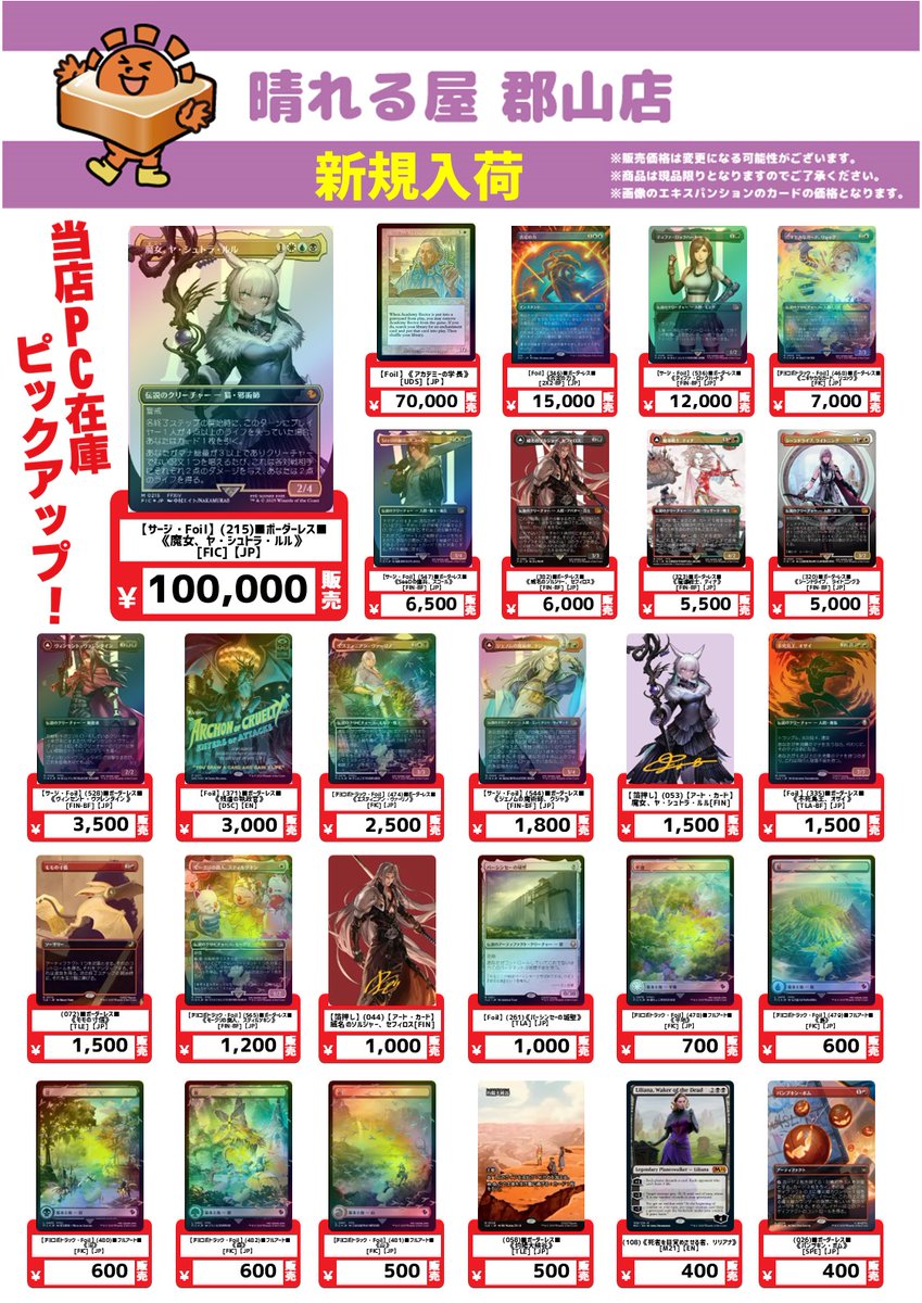 【#晴れ郡商品情報】 『より良い品物』コーナーに新カード追加‼️ 🎯今回のオススメ🎯 《夜陰明神》EN ¥400 《白羽山の冒険者》EN ¥400 など その他にも様々なカードをご用意しております✨ お求めは郡山アティ8F『晴れる屋郡山店』まで‼️😆