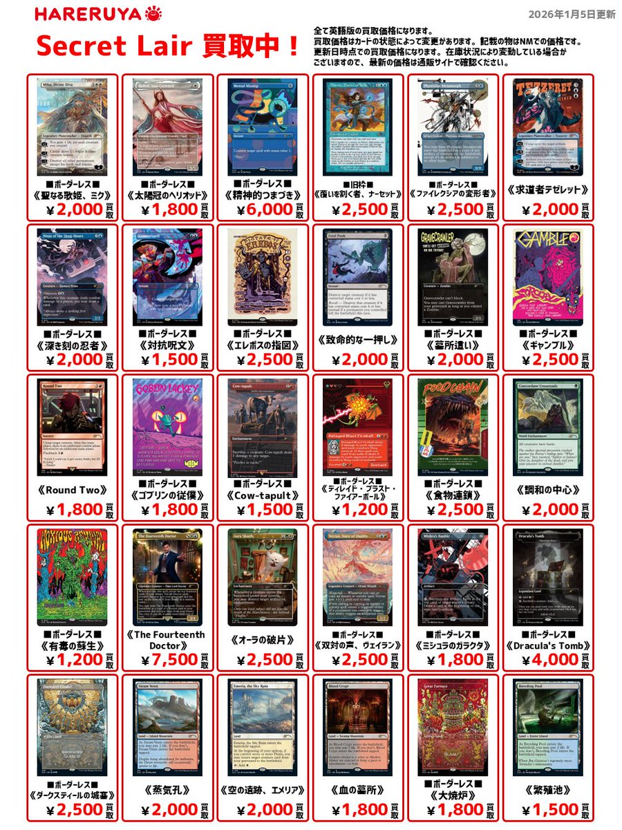 【買取情報】 🧙♂️『Secret Lair』買取募集中🧙♂️ 英語・通常版参考価格はこちら🔽 《The Fourteenth Doctor》[SLD] ¥7,500 《精神的つまづき》[SLD] ¥6,000 《Dracula’s Tomb》》[SLD] ¥4,000 《聖なる歌姫、ミク》[SLD] ¥2,000 スリーブ抜きやソートは不要です🙌 皆さまのお持ち込みお待ちしてます🙇♂️
