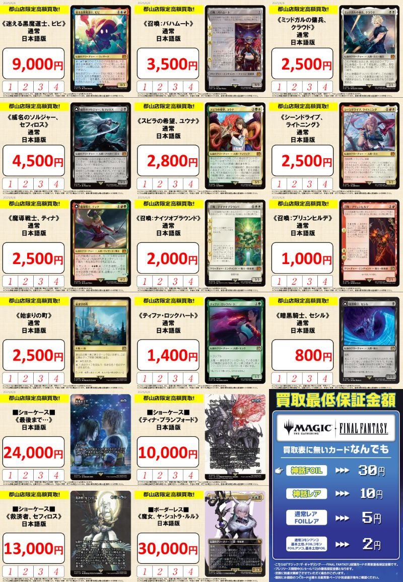 【買取情報】 『FINAL FANTASY』買取超受付中‼️ さらに、6/12(木)までパワーアップした最低保証買取価格となっております💪✨ ぜひ晴れる屋郡山店にプレリリースやドラフト、BOX開封から出たFFのカードをぜひお持ち込みください‼️😆 皆様のご来店、お待ちしております🙇♂️