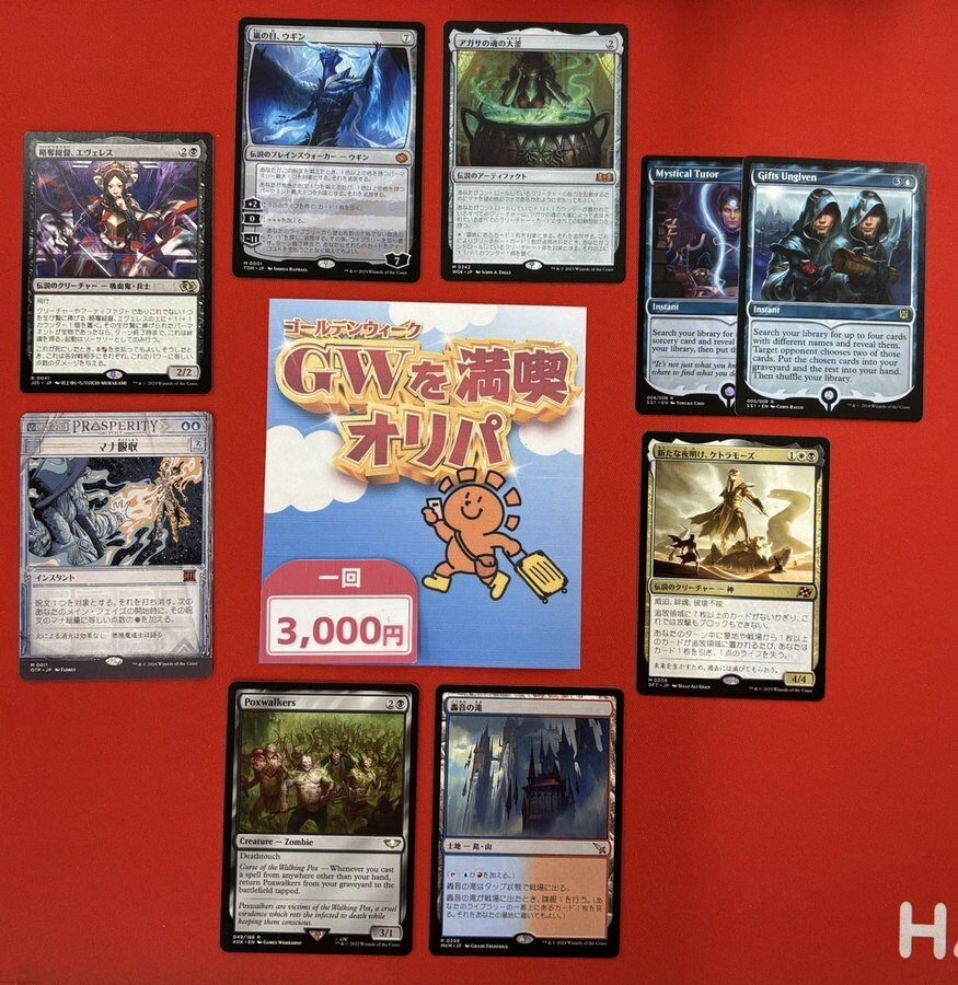 【#晴れ郡商品情報】 『GWを満喫オリパ』好評発売中‼️ まだだッ!まだGWは終わっていないッッ!💪 🎯統率者で人気カードをピックアップ🎯 1⃣ついに解禁《けちな贈り物》 2⃣タルキールの主《嵐の目、ウギン》 など多数収録😎 1回3,000円💰 自販機コーナーで皆さまの挑戦お待ちしてます✨