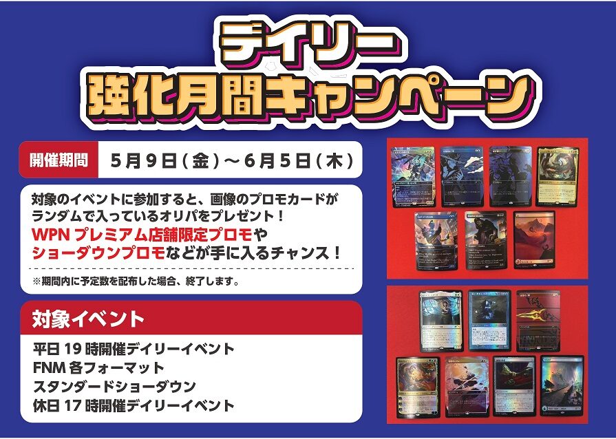 【#晴れ郡イベント】 🔥『デイリー強化月間キャンペーン』開催中🔥 ⏰期間:5/9(金)~6/5(木) ✅強化対象 ・平日19時/休日17時デイリーイベント ・FNM各フォーマット ・スタンダードショーダウン 残り2週間を切りました💦 皆様奮ってご参加ください‼️💪