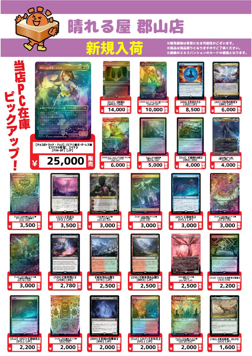【店舗情報】 本日も晴れる屋郡山店にご来店いただき ありがとうございました‼️ 1/26(月)は14時オープン☀️ ✨注目イベント✨ ✅スタンダード・ショーダウン 🎯注目商品🎯 ✅『マジック:ザ・ギャザリング——FINAL FANTASY』コレクター・ブースター