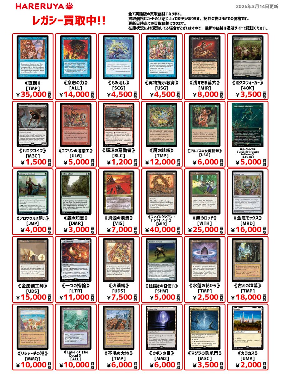 【買取情報】 😮レガシーの買取募集中😮 英語版参考価格はコチラ🔽 《直観》[TMP] ¥35,000 《無のロッド》[WTH] ¥25,000 《金属モックス》[MRD] ¥16,000 《一つの指輪》[LTR] ¥11,000 《アルゴスの女魔術師》[USG] ¥6,000 1⃣枚からでも大歓迎です‼️ 皆さまのご来店お待ちしております🙏