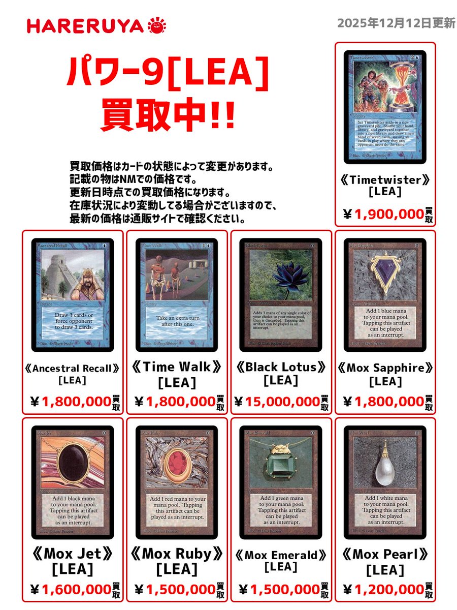 【買取情報】 9⃣パワー9買取募集中9⃣ 買取価格はコチラ 《Black Lotus》[LEA] ¥15,000,000買取 《Timetwister》[LEA] ¥1,900,000買取 《Mox Sapphire》[2ED] ¥750,000買取 《Mox Jet》[2ED] ¥650,000買取 スタッフが丁寧に査定を行います‼️ 皆さまのお持ち込み、お待ちしております🙇♂️