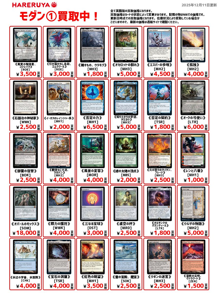 【買取情報】 🔧モダン買取募集中🔧 英語版の買取価格🆙商品はコチラ 《否定の力》[MH1] ¥6,500 《オセロットの群れ》[MH3] ¥5,000 《ウルザの物語》[MH2] ¥5,000 《エスパーの歩哨》[MH2] ¥4,500 1枚から買取🆗✨ ソートやスリーブ抜きも不要です👍 皆さまのお持ち込み、お待ちしております🙇♂️